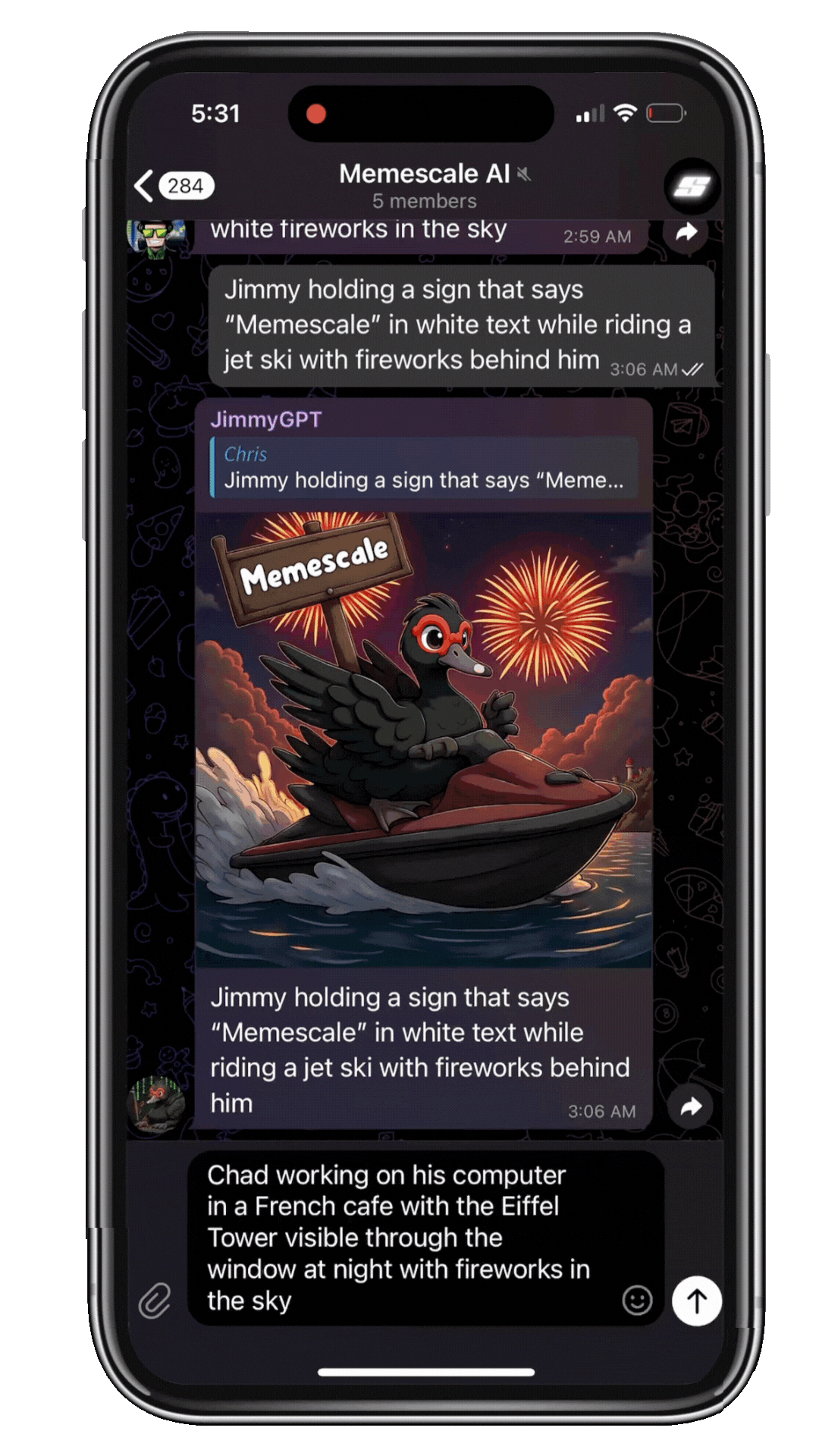Community member types trigger followed by description. Bot queues, generates, delivers. Works in any group.